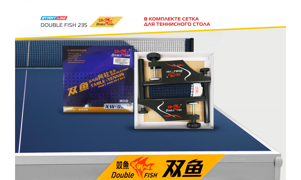 Стильный и лаконичный дизайн теннисного стола является еще одним преимуществом модели Double Fish 235. Важно, что в комплекте со столом идет профессиональный набор аксессуаров для настольного тенниса. В набор входят сетка XW-923 для теннисного стола, две ракетки J8 c накладками ITTF в чехлах, а также мячи 6 шт 3* и 10 шт 1*.